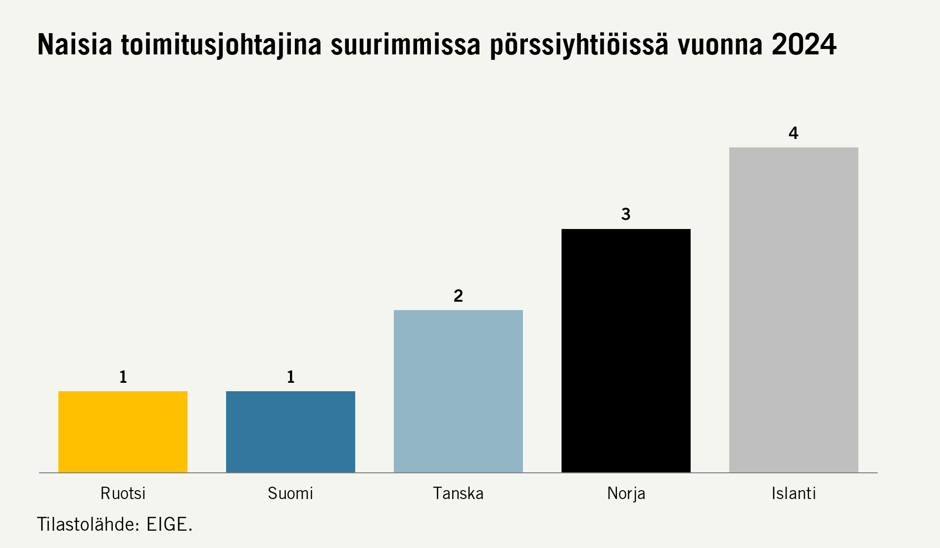 Ruotsissa on suurimpien pörssiyhtiöiden toimitusjohtajana yksi nainen, Sinch-teknoyhtiön Laurinda Pang. Suomessa suurimpien pörssiyhtiöiden toimitusjohtajista on yksi nainen, Orion-lääkeyhtiötä johtava Liisa Hurme. Pörssiyhtiöiden toimitusjohtajista löytyy kaksi muuta naista, Fiskarsin Nathalie Ahlström ja Marimekon Tiina Alahuhta-Kasko.