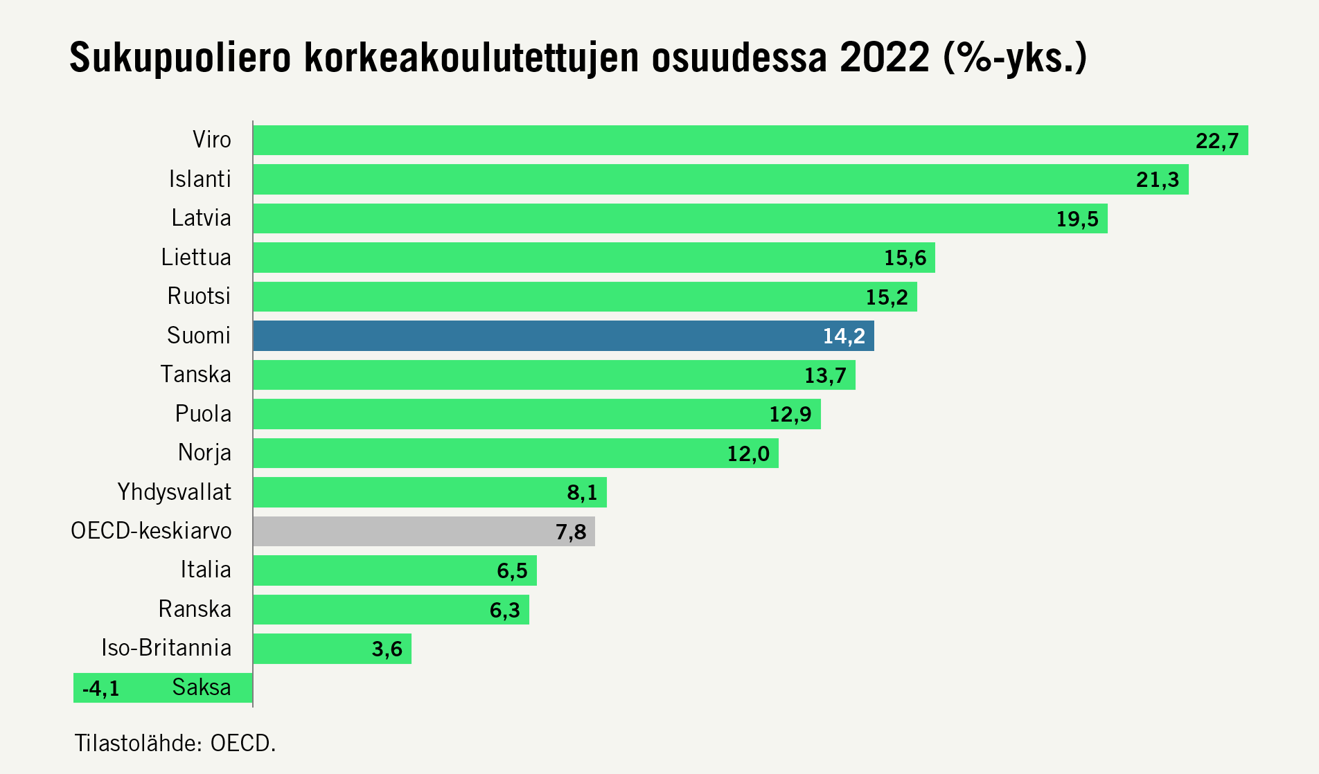 Baltian maissa ja Pohjoismaissa naisten osuus korkeakoulutetuista on selvästi suurempi kuin miesten.