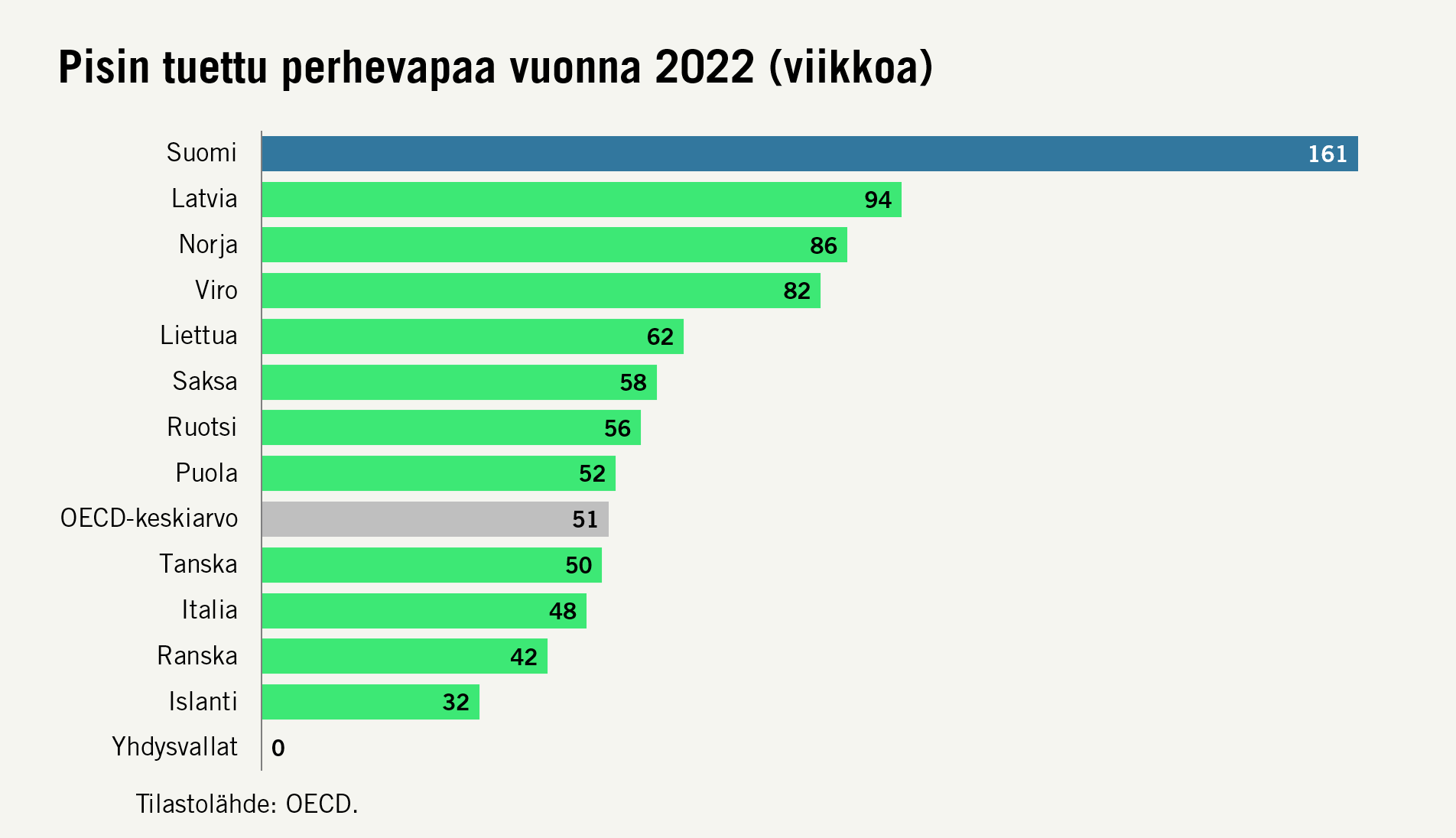 Suomessa pisimmillään 161 viikon vapaan mahdollisuus selittyy sillä, että mukaan lasketaan myös kotihoidontuki. Vastaavia järjestelmiä on myös muualla. Äitien pitkillä vapailla on merkitystä sen kannalta, minkälaiset kannusteet äideillä on palata lasten kanssa kotona vietetyn ajan jälkeen takaisin töihin. Erityisesti pitkät kotihoidontuella vietetyt jaksot lyhentävät naisten työuria.