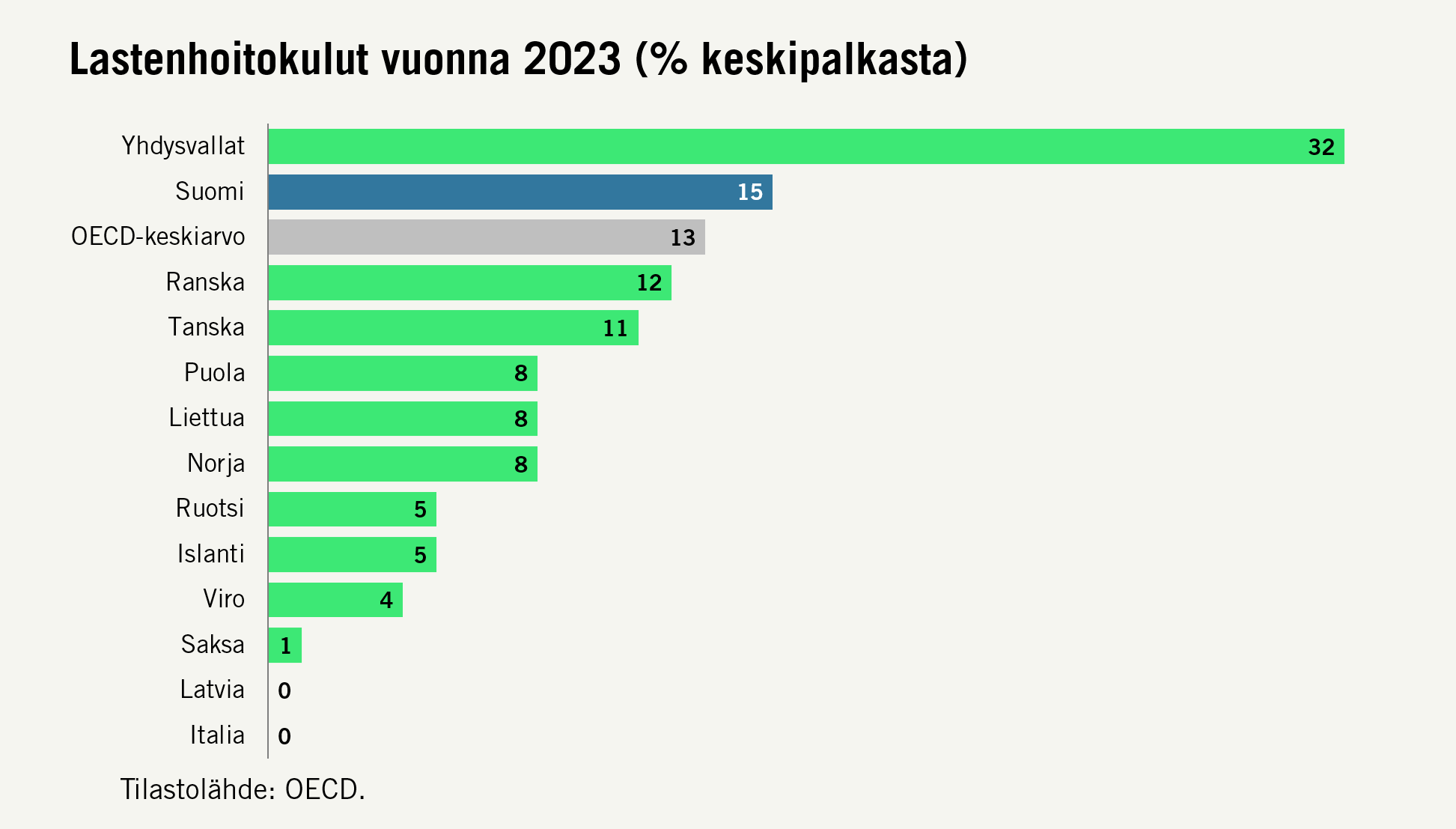 Lastenhoitokulut muodostavat noin kolmasosan työntekijän keskipalkasta Yhdysvalloissa. Suomessa lastenhoitokulut ovat OECD-keskiarvoa suuremmat.
