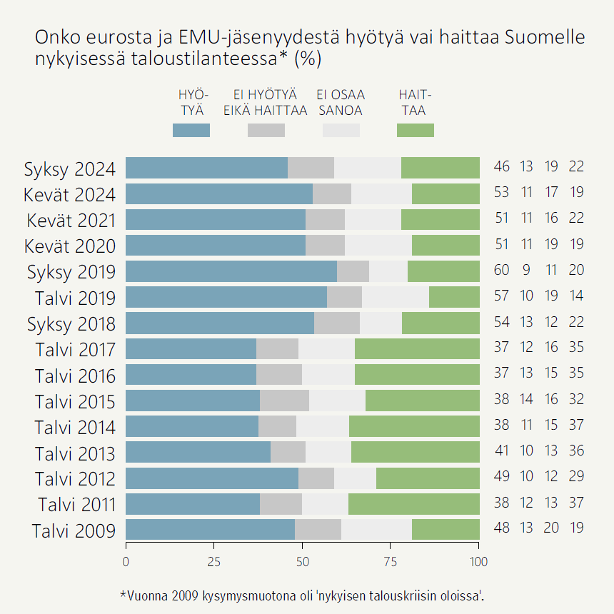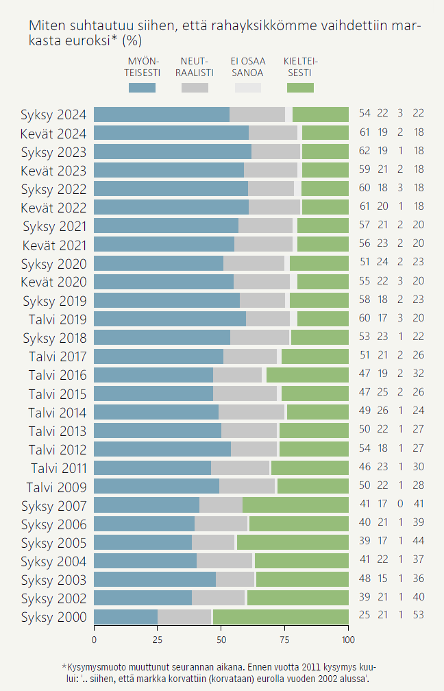 Suhtautuminen euroon on halki vuosikymmenten kulkenut pitkälti käsi kädessä EU-jäsenyyden suosion kanssa. Alun alkaen jakautunut suhtautuminen yhteisvaluuttaan alkoi kehittyä myönteisempään suuntaan vuosien 2007–2009 finanssikriisin jälkeen. Euromyönteisyys saavutti toistaiseksi korkeimmat lukemansa vuosi sitten, syksyllä 2023 – korkealle nousseista koroista huolimatta.