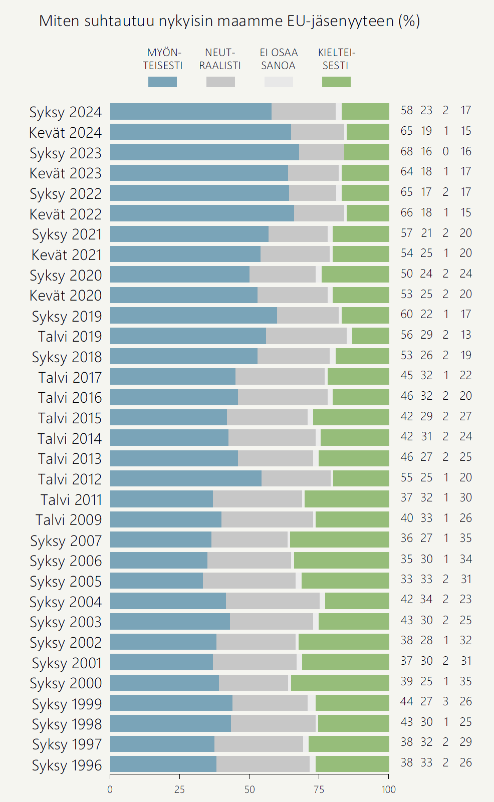EU-myönteisyys on vähentynyt seitsemän prosenttiyksikköä viime keväästä. Muutos ei kuitenkaan heijastu EU-kielteisyyden yleistymisenä, vaan näkyy ensisijaisesti EU:hun neutraalisti suhtautuvien osuuden kasvuna. Isossa kuvassa EU-jäsenyyden suosio palautuu tasolle, jolla se oli syksyllä 2021, ennen Venäjän laajamittaista hyökkäystä Ukrainaan.