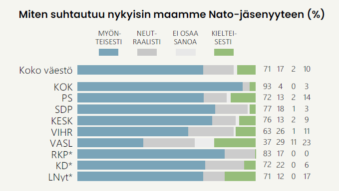 Kokoomuksen kannattajista peräti 93 prosenttia suhtautuu Natoon myönteisesti, mikä tekee siitä Nato-myönteisimmän puolueen. Selvästi pienintä Nato-myönteisyys on vasemmistoliiton kannattajien keskuudessa, joista 37 prosenttia suhtautuu jäsenyyteen myönteisesti, 23 prosenttia kielteisesti ja 29 prosenttia neutraalisti. Keskimääräistä vähäisempää Nato-myönteisyys on myös vihreiden kannattajien keskuudessa, joista 63 prosenttia suhtautuu puolustusliittoon myönteisesti.