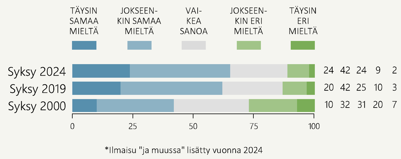 Näkemykset arvopaperisijoittamista kohtaan ovat muuttuneet hieman (4 %-yks.) hyväksyvämpään suuntaan syksyn 2019 mittauksesta. Asenteet ovat kuitenkin huomattavasti suopeampia sijoittamiselle kuin vielä vuonna 2000. Tuolloin elettiin IT-kuplan aikaa, joka oli saman vuoden keväällä saavuttanut huippunsa ja osakekurssien arvostustasot alkoivat syksyllä jo pienentyä. Isossa kuvassa asennemuutosta selittänee myös pörssiosakkeita ja sijoitusrahastoja omistavien henkilöiden määrän huomattava kasvu vuosituhannen alusta.
