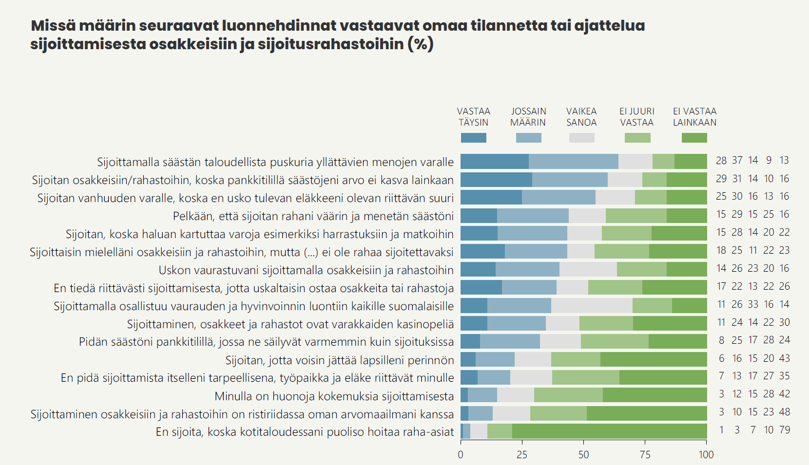 35 prosenttia suomalaisista ajattelee ainakin jossain määrin, että sijoittaminen, osakkeet ja rahastot ovat varakkaiden kasinopeliä. Enemmistön (52 %) ajattelua luonnehdinta ei vastaa.