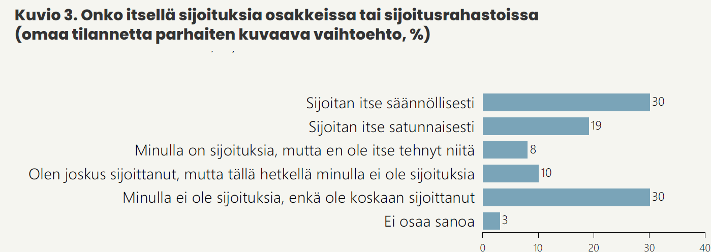 Arvopaperisijoittaminen on suomalaisille melko arkipäiväistä. Arvo- ja asennetutkimuksen mukaan puolet sijoittaa säännöllisesti (30 %) tai satunnaisesti (19 %) osakkeisiin tai sijoitusrahastoihin. Kahdeksalla prosentilla on sijoituksia, joita ei ole tehnyt itse, ja kymmenen prosenttia on sijoittanut joskus aiemmin, mutta ei tällä hetkellä omista sijoituksia. Kolme kymmenestä (30 %) ei ole koskaan sijoittanut osakkeisiin tai sijoitusrahastoihin (Kuvio 3).