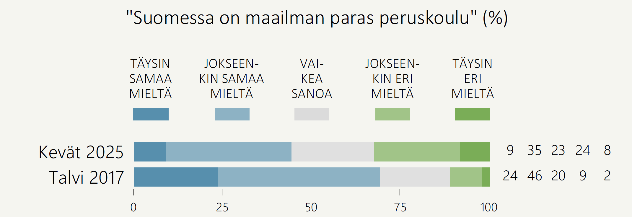- Suomalaisista 44 prosenttia on sitä mieltä, että Suomessa on maailman peruskoulu. Näin arvioivien osuus on pudonnut 26 prosenttiyksikköä edelliseen, vuoden 2017 mittaukseen nähden.
