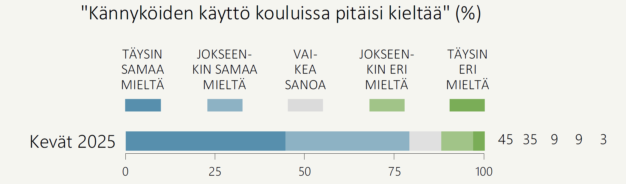 Hallitus päättikin loppuvuodesta 2024 älylaitteiden käyttörajoituksista oppitunneilla. [6] Tämä ei suomalaisten mielestä riitä, sillä 80 prosenttia suomalaisista on sitä mieltä, että kännyköiden käyttö kouluissa pitäisi kieltää (Kuvio 2). Vain 12 prosenttia ei kieltäisi kännyköiden käyttöä kouluissa ainakaan kokonaan.