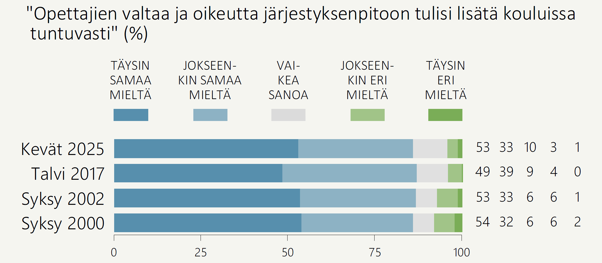 Ylipäänsä suomalaiset odottavat kouluihin kurinpalautusta. Suomalaisista 86 prosenttia on sitä mieltä, että opettajien valtaa ja oikeutta järjestyksenpitoon tulisi lisätä kouluissa tuntuvasti. Käytännössä katsoen juuri ketkään (4 %) eivät Suomessa ole sitä mieltä, etteivätkö opettajat tarvitsisi lisää keinoja järjestyksenpitoon kouluissa.