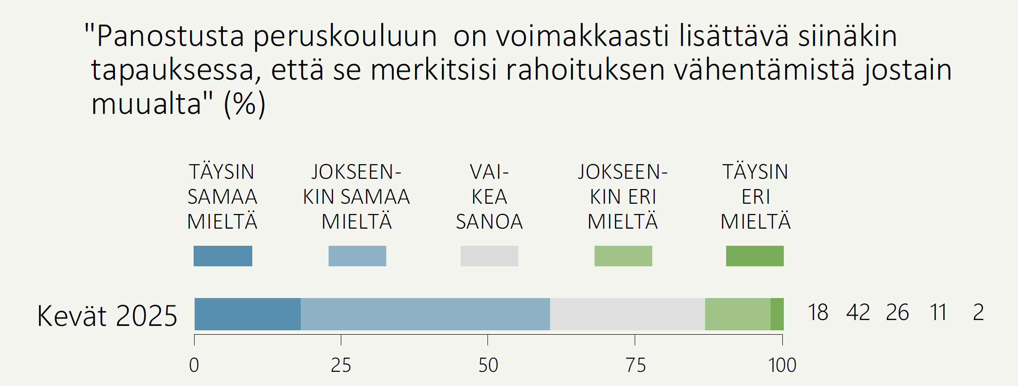 Valmius priorisoida peruskoulua voimakkaasti rahoitusta jaettaessa on osapuilleen yhtä laajaa kaikissa väestöryhmissä, joskin varsin moni, keskimäärin neljäsosa (26 %), ei ota asiaan kantaa (ks. Kuvioliite). [7]