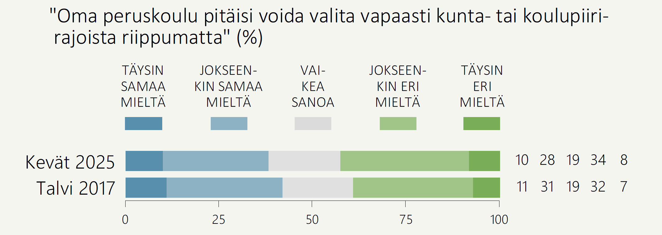 Kun suhtautumisessa koulun valintaan ei ole tapahtunut suuria muutoksia vuodesta 2017 (ks. Kuvio 5 edellä), johtunee havaittu mielenmuutos pääosin kysymyksenasettelun vaihtumisesta. Tämä tuo esiin aiheeseen sisältyvän dilemman: moni arvostaa vanhempien mahdollisuutta valita lastensa koulu, eikä siksi ollut vuoden 2017 kyselyssä valmis kuvailemaan tätä sinänsä huonoksi asiaksi, vaikka tunnistaisikin valinnanvapaudesta mahdollisesti seuraavat, koulujen eriytymiseen liittyvät ongelmat.