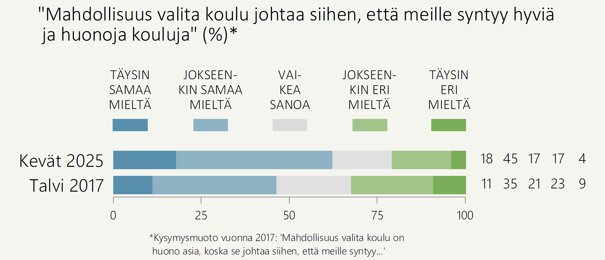 Vuonna 2017 kouluvalinnan seurauksista kysyttiin hieman eri kysymysmuodolla. Silloin vastaajia pyydettiin ottamaan kantaa väitteeseen, jonka mukaan mahdollisuus valita koulu on huono asia, koska se johtaa hyvien ja huonojen koulujen syntymiseen. [8] Alle puolet vastasi kouluvalinnan olevan huono asia siitä aiheutuvan eriytymisen takia.