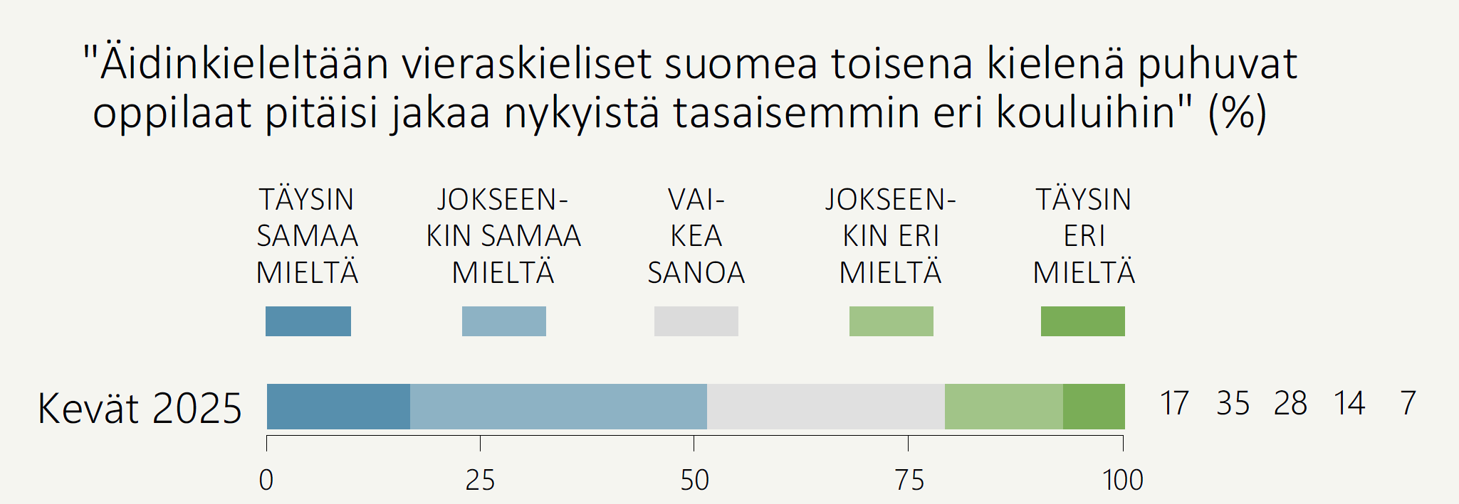Etenkin suuremmilla kaupunkiseuduilla kouluvalinta liittyy siihen, minkä verran kouluissa on oppilaita, joiden äidinkieli ei ole kotimainen kieli. Suomalaisten huoli koulujen eriytymisestä tulee esiin kysyttäessä, pitäisikö äidinkieleltään vieraskieliset suomea toisena kielenä puhuvat oppilaat jakaa nykyistä tasaisemmin eri kouluihin. Niukasti yli puolet (52 %) yhtyy tähän näkemykseen ja viidesosa (21 %) torjuu ajatuksen vieraskielisten tasaisemman jakamisen eri kouluihin (Kuvio 7).