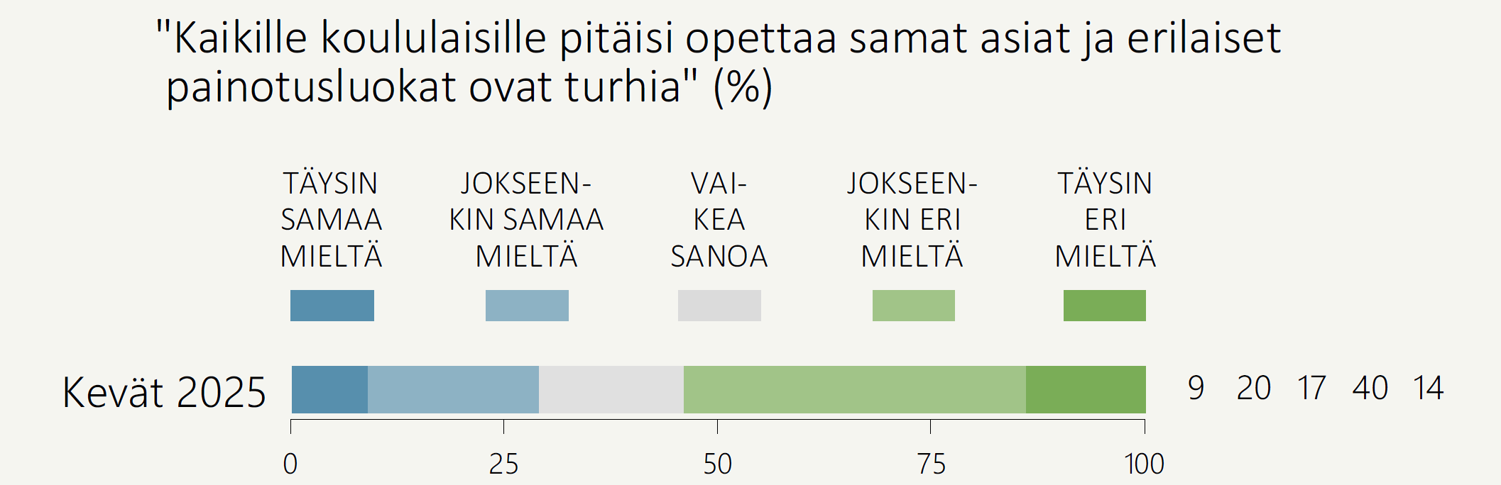 Vain kolme kymmenestä (29 %) on sitä mieltä, että kaikille koululaisille pitäisi opettaa samat asiat ja erilaiset painotusluokat ovat turhia (Kuvio 8). Enemmistö (54 %) torjuu ajatuksen painotusluokkien turhuudesta.