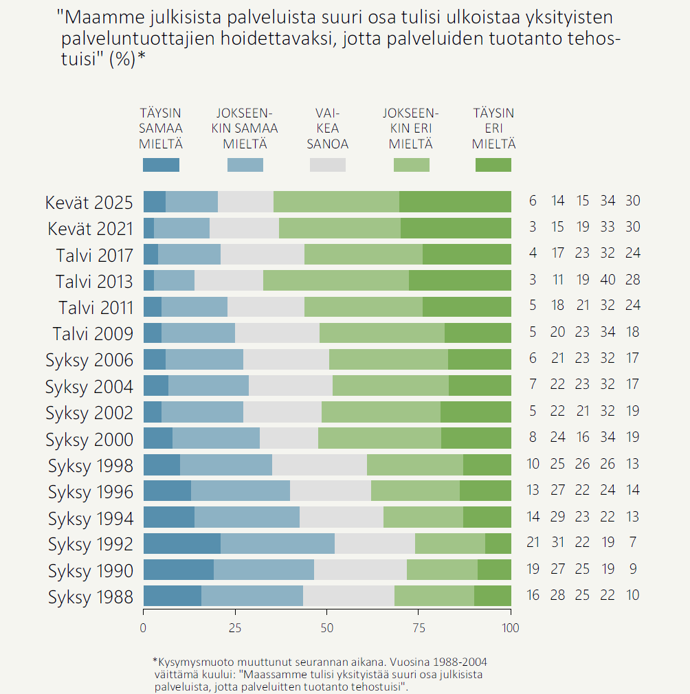 Tuki laajamittaisille julkisten palveluiden ulkoistamisille säilyy edellisten kuntavaalien alla mitatulla alhaisella tasolla. Pidemmällä aikavälillä suhtautuminen laajamittaisiin ulkoistamisiin on asteittain muuttunut paljon kielteisemmäksi vuodesta 1992, jolloin puolet suomalaisista oli valmis siirtämään suuren osan julkisista palveluista yksityisten palveluntuottajien hoitoon. Tuolloin Suomessa elettiin keskellä syvää lamaa, jossa työttömyys räjähti, talous sukelsi ja julkisen talouden pohja oli putoamassa pois.