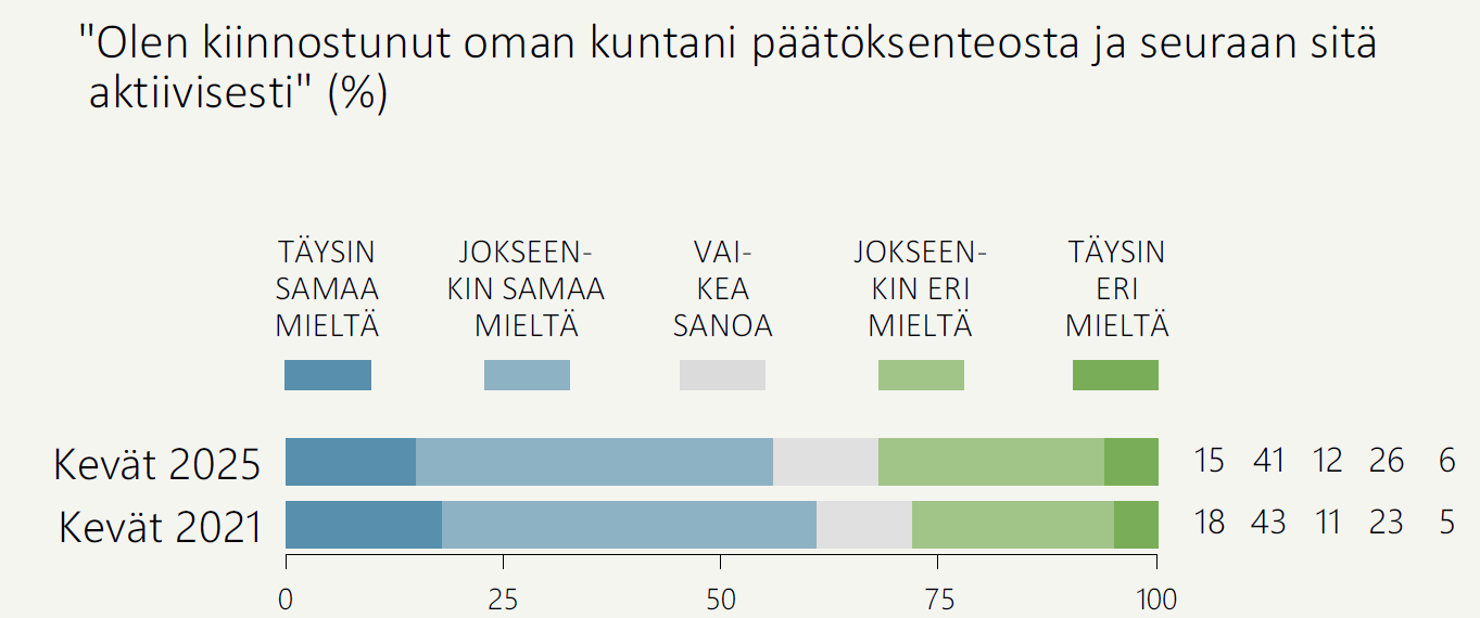Oman kunnan päätöksentekoa kohtaan tunnettu kiinnostus on hieman notkahtanut edellisten kuntavaalien alla vuonna 2021 tehdystä mittauksesta. Muutos on kuitenkin suuruusluokaltaan vähäinen, ja sitä saattaa selittää kuntien tehtävien merkittävä keventyminen sosiaali- ja terveydenhuollon tehtävien siirryttyä kunnilta hyvinvointialueille vuoden 2023 alusta alkaen.