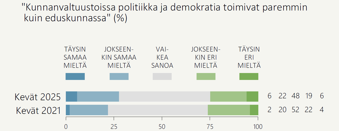 Samaan viittaa myös se, etteivät suomalaiset osaa ottaa kantaa puoleen tai toiseen tiedusteltaessa, toimiiko demokratia paremmin kunnissa kuin eduskunnassa. Vajaa kolme kymmenestä (28 %) arvioi, että kunnanvaltuustoissa politiikka ja demokratia toimivat paremmin kuin eduskunnassa, ja lähes yhtä moni (25 %) ei jaa käsitystä. Hyvin suuri osuus (48 %) ei kuitenkaan osaa arvioida asiaa (Kuvio 4).