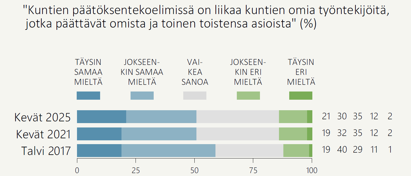 Arvio kuntien omien työntekijöiden yliedustuksesta päätöksenteossa ei ole muuttunut vuoden 2021 kuntavaalien alla tehdystä kyselystä, joskin se on aavistuksen vähäisempää kuin kahdeksan vuotta sitten.