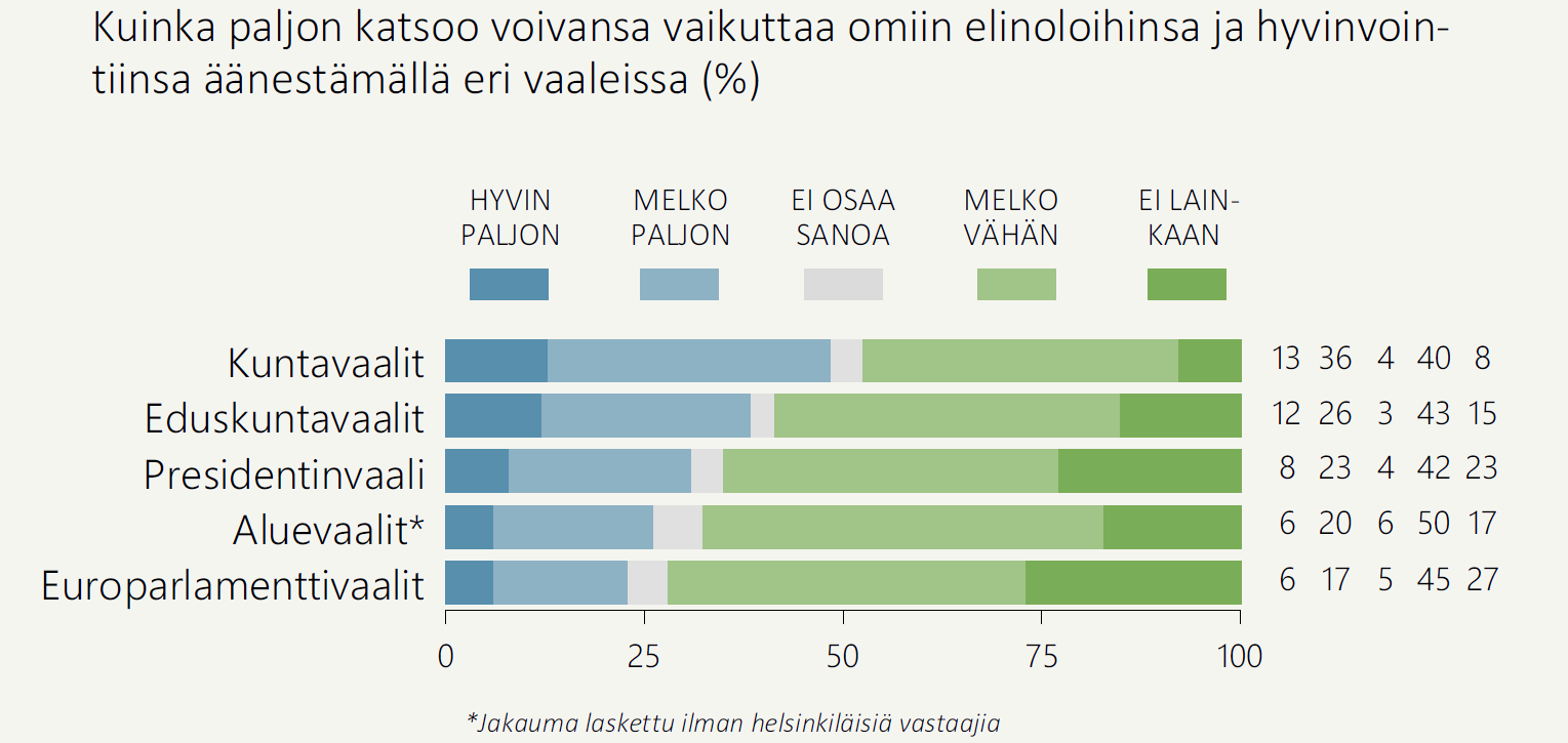 Huomio kiinnittyy kuitenkin kuntavaalien kanssa samaan aikaan järjestettäviin aluevaaleihin, joissa äänestämällä vain neljäosa (26 %) katsoo voivansa vaikuttaa omiin elinoloihinsa ja hyvinvointiinsa, ja kaksi kolmesta (67 %) ei tähän usko. Kuvaavaa on, että suomalaiset kokevat presidentinvaalissa (31 %) annetulla äänellä olevan aluevaaliääntä enemmän vaikutusta omiin elinoloihin ja hyvinvointiin. Aluevaaleja merkityksettömämmiksi arvioidaan vain europarlamenttivaalit (23 %).