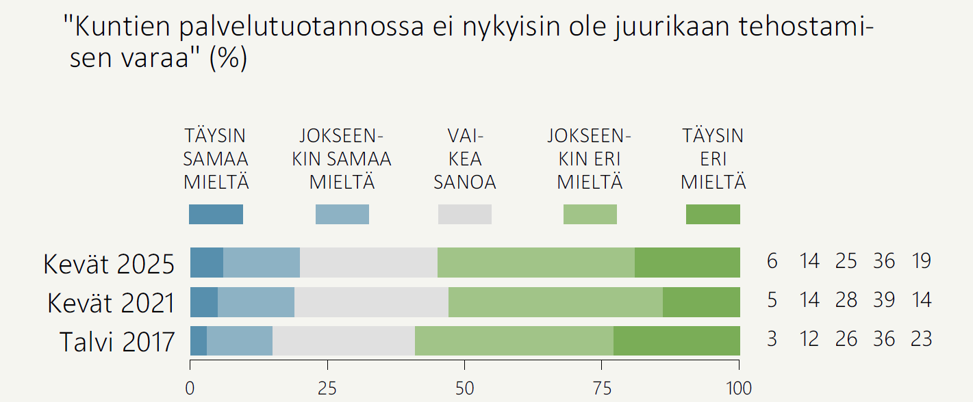 Suomalaisten arviot kunnallisen palvelutuotannon tehostamisvarasta eivät juuri ole muuttuneet edellisten kuntavaalien alla mitatuista lukemista. Enemmistöt lähes kaikissa väestöryhmissä näkevät palvelutuotannossa löysää, jota voitaisiin tehostaa pois. Hieman keskimääräistä epäileväisempiä tehostamisvaran olemassaolosta ovat ammattiliittoihin kuuluvat sekä äänestäjäryhmistä SDP:n ja kristillisdemokraattien [5] kannattajat. Näissäkin ryhmissä useampi kuitenkin näkee palvelutuotannossa tehostamisvaraa kuin torjuu sen olemassaolon (ks. Kuvioliite).