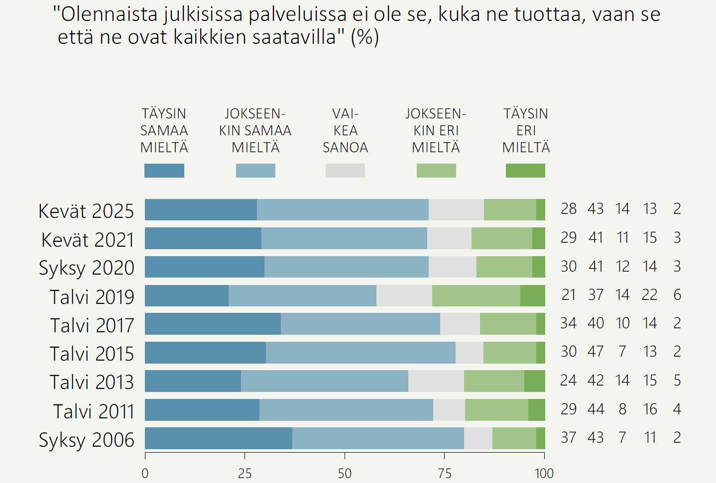 Suomalaisten avoimuus palveluiden monituottajuudelle on isossa kuvassa säilynyt varsin vakaana läpi vuosikymmenten, eikä aihe liioin nostata merkittävämpiä ideologisia laineita edes puolueiden äänestäjäryhmissä (ks. Kuvioliite).