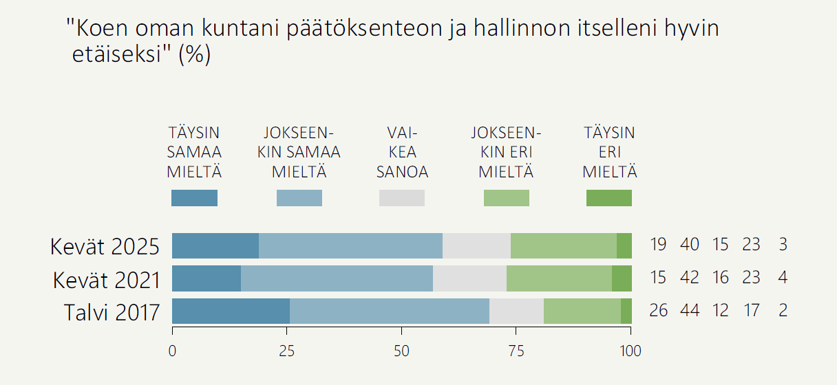 Suomalaisista 59 prosenttia kokee oman kuntansa päätöksenteon ja hallinnon itselleen hyvin etäiseksi. Neljäsosalle (26 %) päätöksenteko ei jää ainakaan tyystin etäiseksi (Kuvio 1).