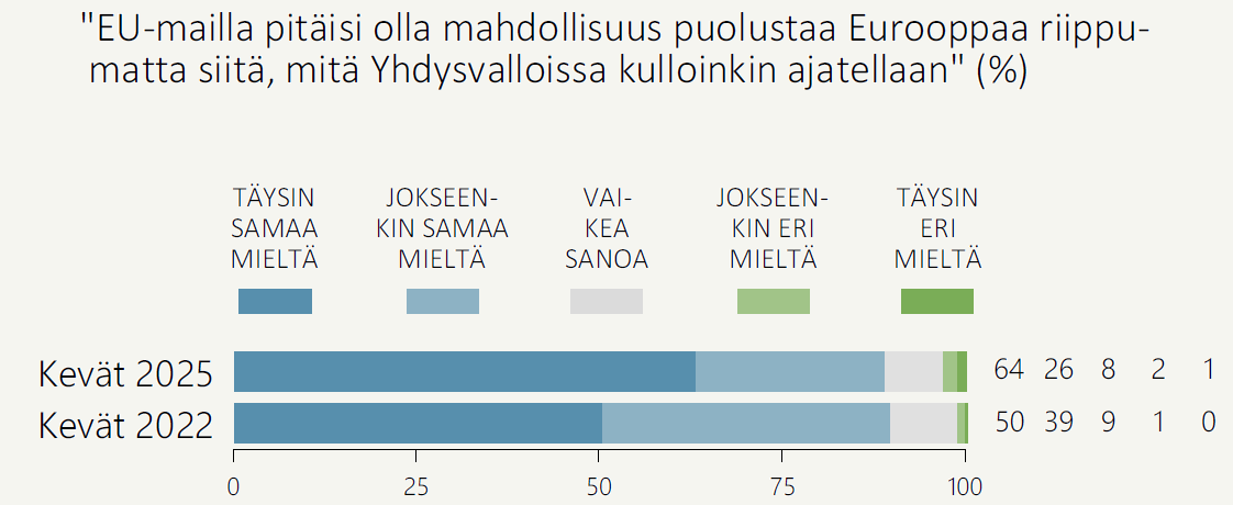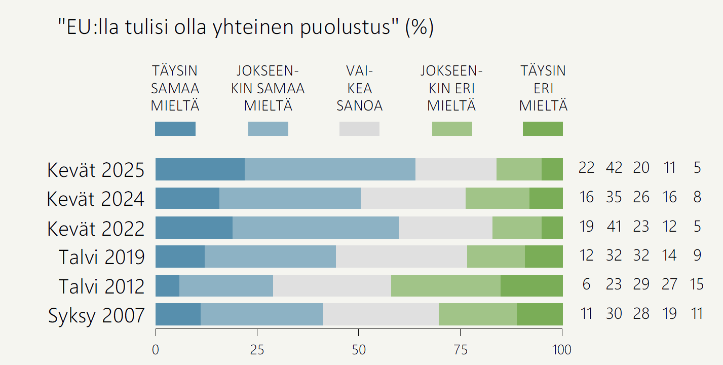 Edellisestä mittauksesta kuluneet kolme vuotta ovat vakuuttaneet suomalaiset entistä vahvemmin Euroopan omavaraisen puolustuksen tarpeellisuudesta. Tästä kertoo poikkeuksellisen suuri väittämään täysin yhtyvien osuus (64 %).
