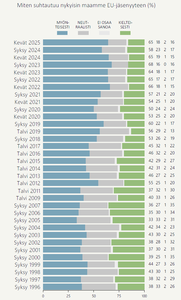 Nyt kaksi kolmasosaa (65 %) suomalaisista suhtautuu maamme EU-jäsenyyteen myönteisesti, vajaa viidesosa (18 %) neutraalisti ja hieman tätä pienempi osuus (16 %) kielteisesti (Kuvio 1).