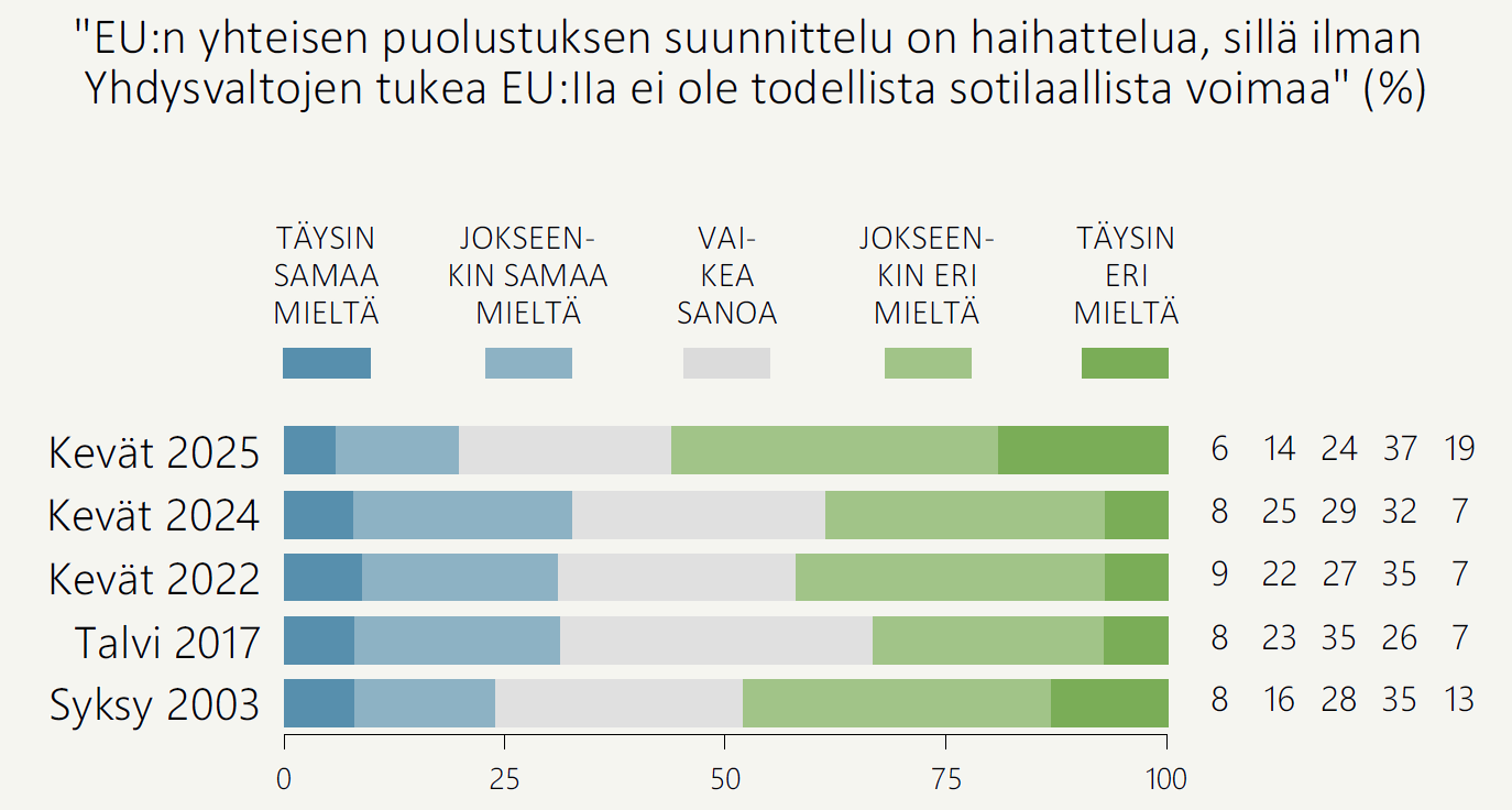 Trumpin toisen kauden aiheuttama epävarmuus maailmanpolitiikassa on lyhyessä ajassa saanut suomalaiset selvästi aiempaa epävarmemmiksi Naton turvatakuiden pitävyydestä ja Yhdysvaltain sitoutumisesta länsimaisten arvojen puolustamiseen. [1] Tämä heijastuu myös suomalaisten odotuksiin EU:n puolustusulottuvuutta kohtaan.