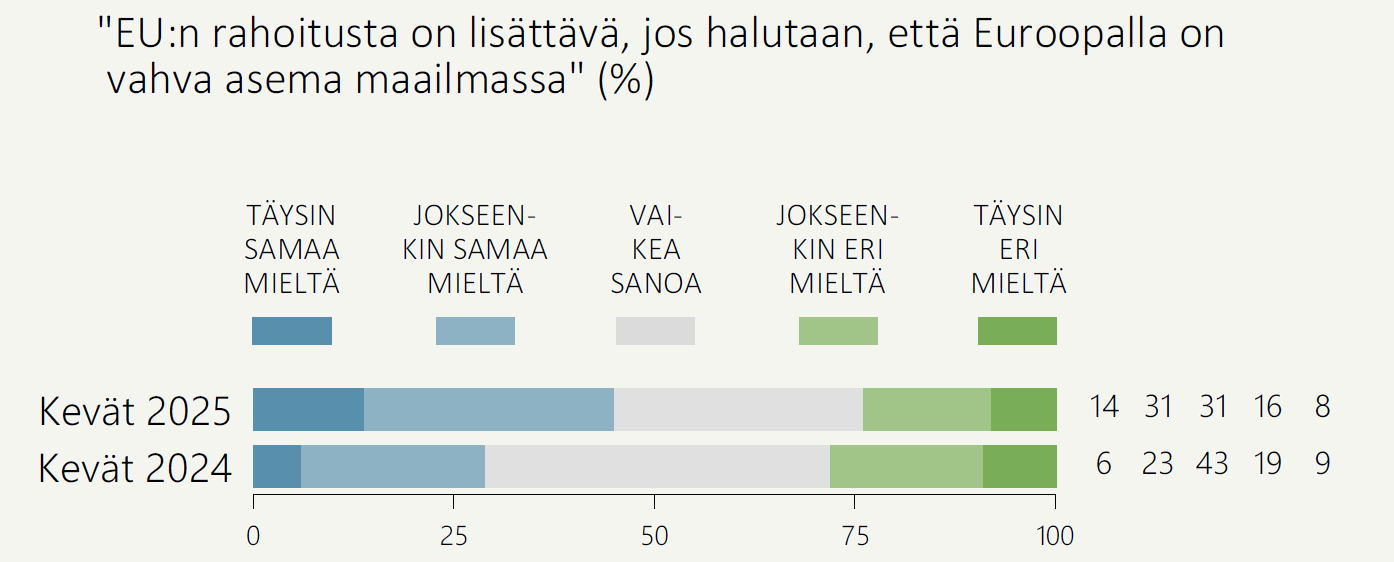 Suomalaisten näkemys EU:n rahoituksen kasvattamiseen on varovaisen myönteinen. 44 prosenttia katsoo, että EU:n rahoitusta on lisättävä, jos halutaan, että Euroopalla on vahva asema maailmassa. Paljon pienempi osuus (25 %) torjuu teesin, mutta varsin moni (31 %) ei osaa asiaan kantaa (Kuvio 7).