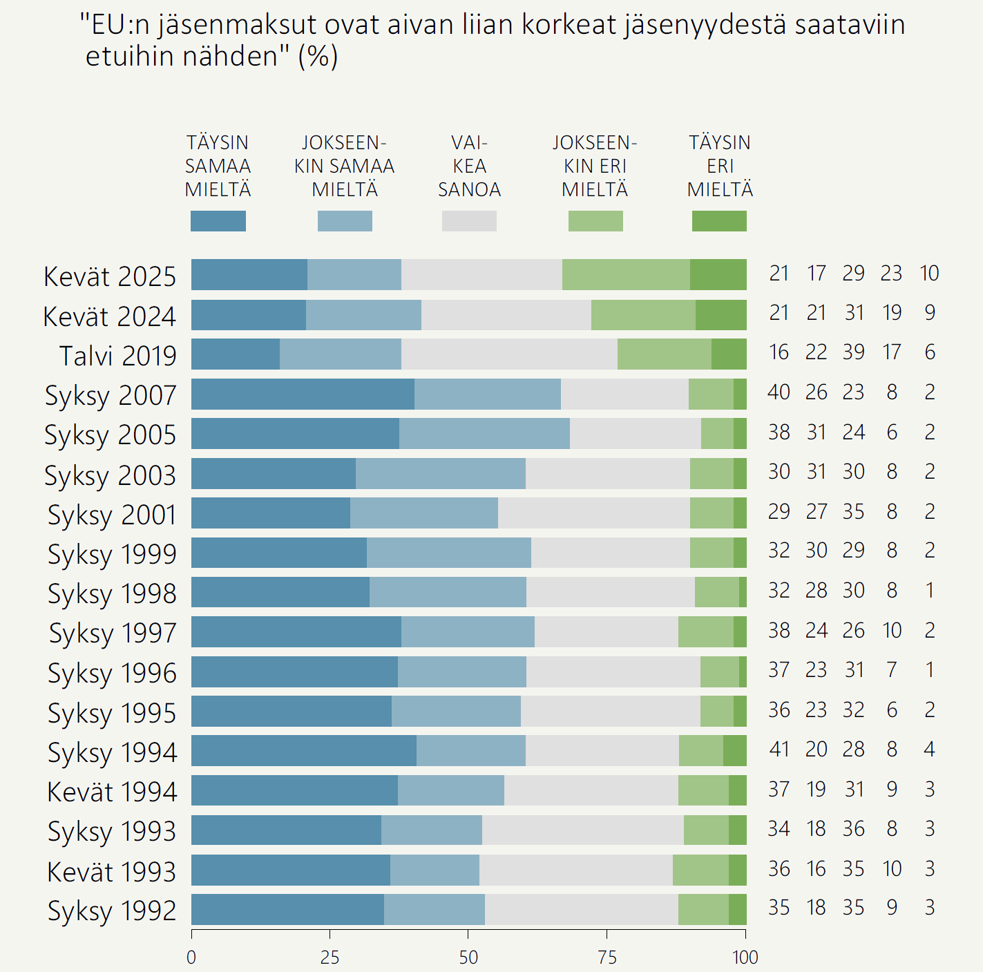 Viime vuosina kritiikki jäsenmaksujen suuruutta kohtaan on kuitenkin ollut selvästi vähäisempää verrattuna euro- ja finanssikriisiä edeltäviin aikoihin ja myös väitteen jäsenmaksujen kohtuuttomuudesta torjuvien osuus on trendinomaisesti kasvanut. Asenteiden muutos kielii siitä, että valmiutta jäsenmaksujen korotuksillekin voisi alkaa löytyä, mikäli niiden käyttökohteet ovat kansalaisten mielestä olennaisia ja ymmärrettäviä. Puolustus on tulosten valossa mitä ilmeisimmin tällainen kohde, mutta suomalaiset ovat yleisesti ottaen varuillaan antamaan EU:lle lisää rahaa.