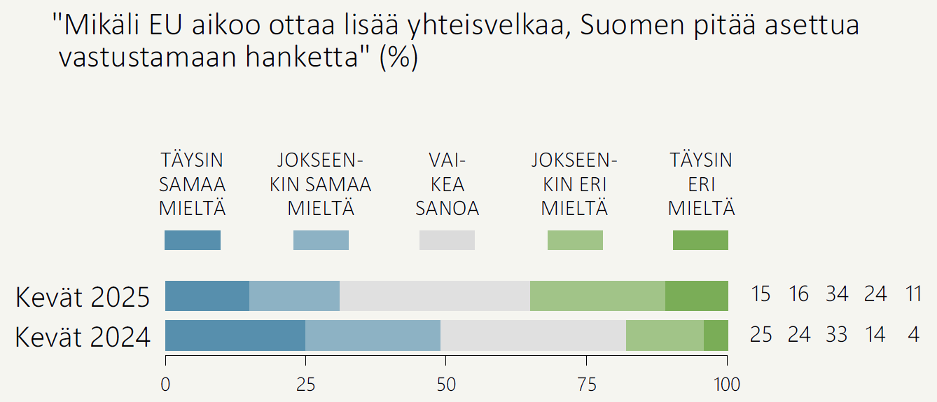 Suomalaisten suhtautuminen uuden EU:n yhteisvelan ottamiseen on tälläkin mittarilla muuttunut paljon suopeammaksi keväästä 2024, jolloin vielä puolet toivoi päättäjiemme sulkevan pois uuden yhteisvelan mahdollisuuden.