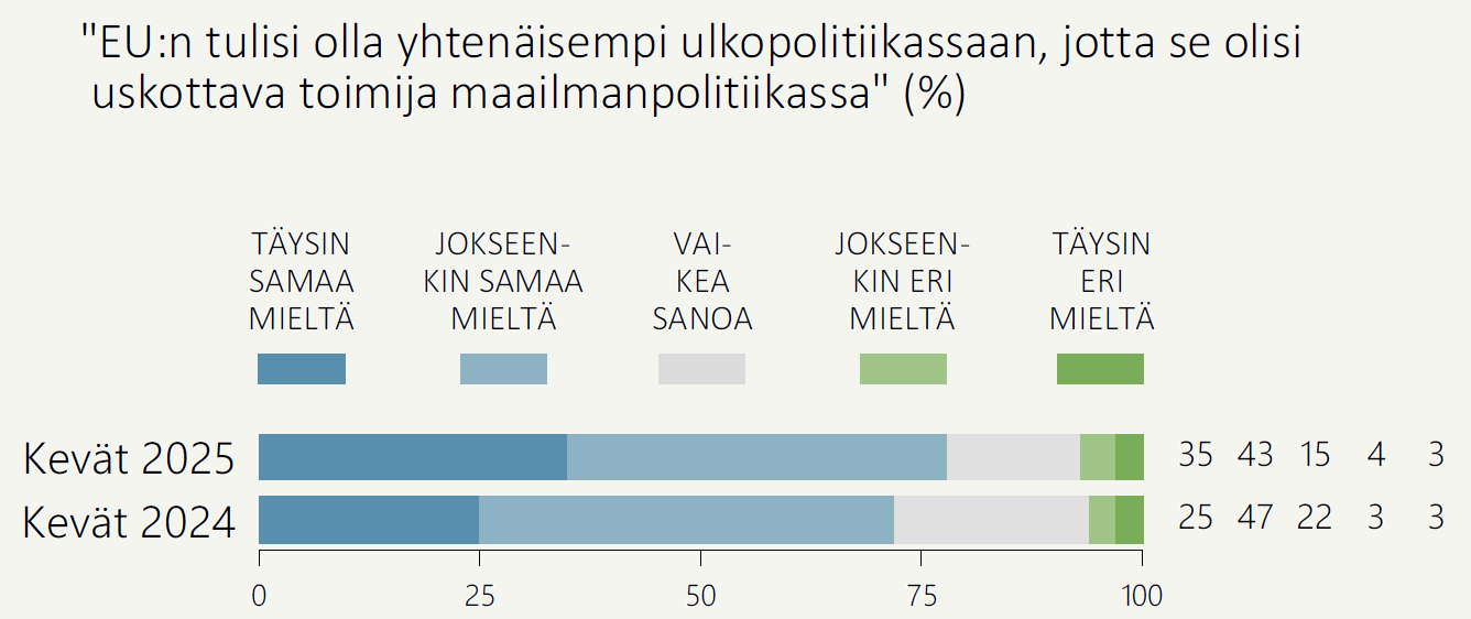 Tuki EU:n yhteiselle puolustukselle on kasvanut tuntuvasti (+13 %-yks) vuoden takaisesta, mikä heijastaa kasvanutta epäilystä siitä, voivatko EU-maat enää täysin luottaa Yhdysvaltojen sotilaalliseen apuun. [4]