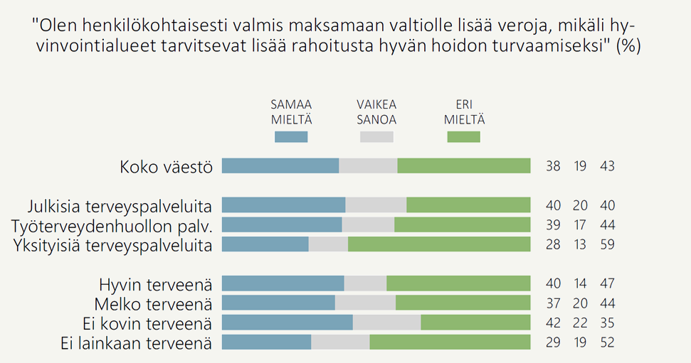 Laajasti jaetuista uhkakuvista huolimatta suomalaisten kukkaron nyörit ovat tiukalla julkisen terveydenhuollon tilan kohentamiseksi verovaroin. Suomalaisista 38 prosenttia olisi henkilökohtaisesti valmiita maksamaan valtiolle lisää veroja, mikäli hyvinvointialueet tarvitsevat lisää rahoitusta hyvän hoidon turvaamiseksi. Hieman useammalla (43 %) valmiutta veronkiristyksiin ei ole, ja viidennes (19 %) jää vaille kantaa (Kuvio 1).