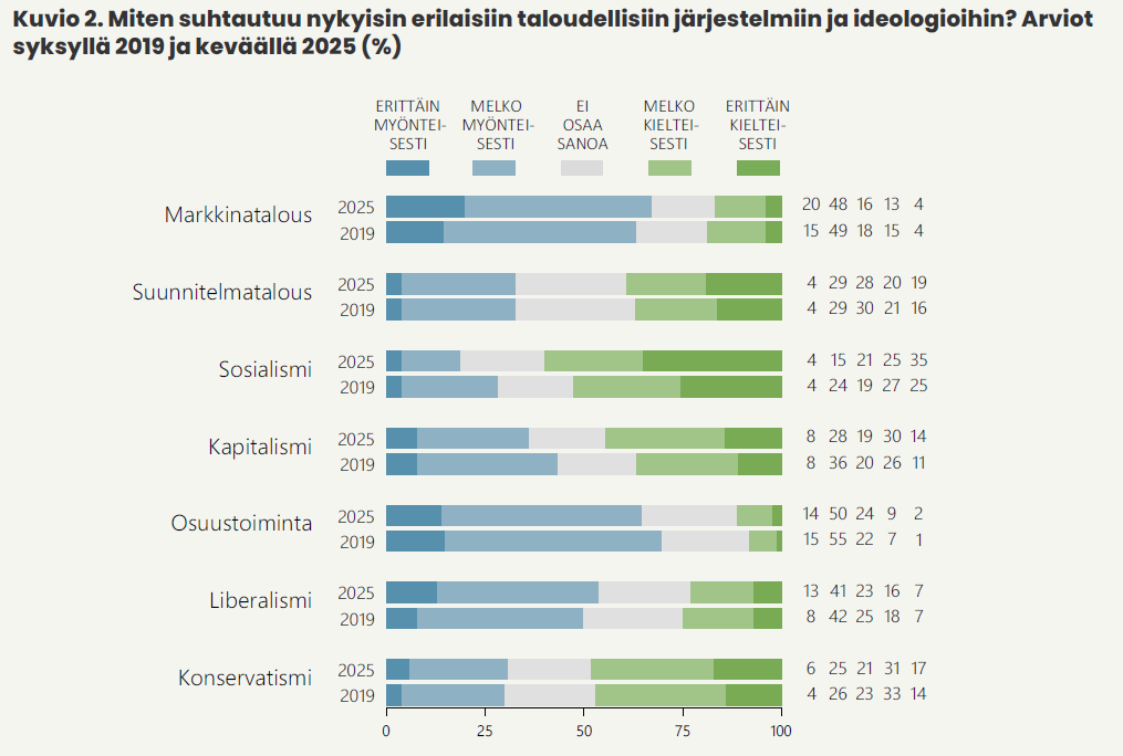 - Markkinatalous on noussut Suomen suositummaksi ideologiaksi EVAn ideologiamittauksessa. Kaksi kolmesta (68 %) suhtautuu siihen nykyään myönteisesti.