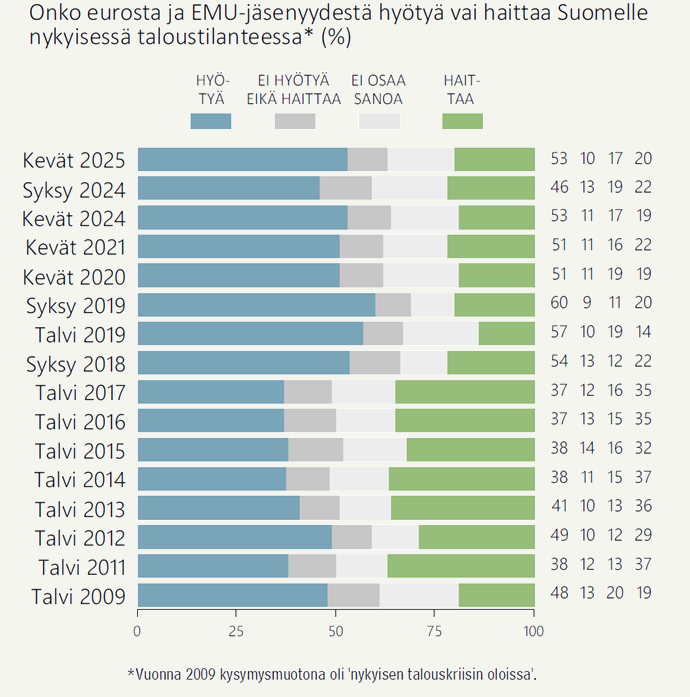 - Niukka enemmistö (53 %) arvioi, että eurosta ja EMU-jäsenyydestä on Suomelle hyötyä nykyisessä taloustilanteessa.