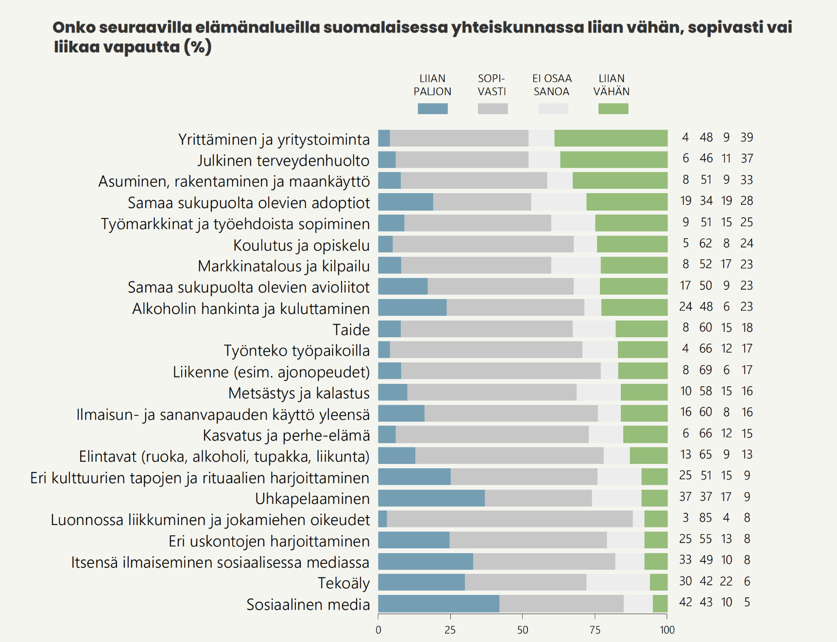 - Useimmilla elämänalueilla suomalaiset arvioivat olevan sopivasti vapautta. Pikemminkin vapauksien vähentämistä kuin lisäämistä toivottaisiin etenkin sosiaalisen median, uhkapelaamisen ja tekoälyn kohdalla.