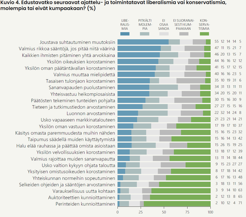 - Myös joustava suhtautuminen muutoksiin (55 %) edustaa suomalaisten enemmistön mielestä ensisijaisesti liberalismia. Vastaavasti varauksellisuus uutta kohtaan liitetään selvästi konservatismiin (63 %).