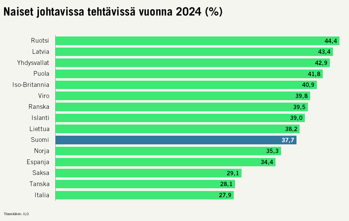 Vuonna 2024 naisjohtajien osuus oli 37,7 prosenttia, kun vuotta aiemmin luku oli 38,4 prosenttia kaikista johtajista. Lasku on pieni, mutta suunta merkityksellinen. Tasa-arvon kehitys johtotehtävissä ontuu.