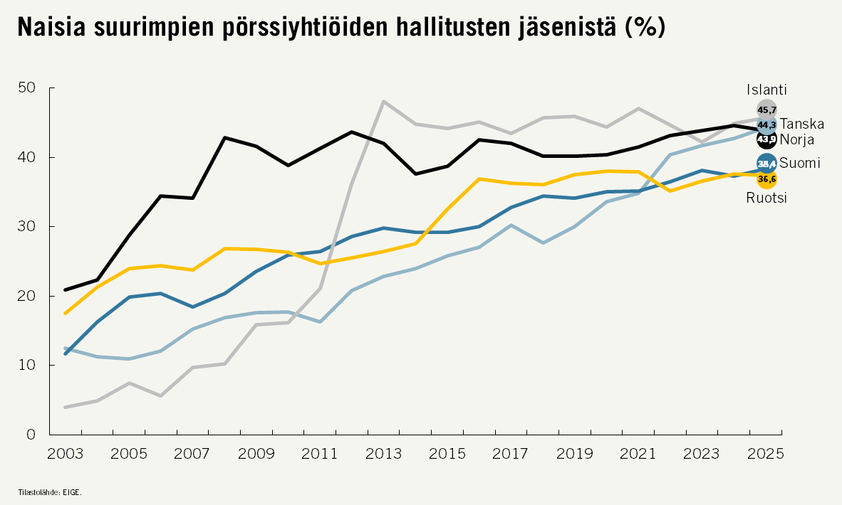 Naisten osuus suurimpien pörssiyhtiöiden hallituksissa on Suomessa 38,4 prosenttia. Luku on lähellä EU:n asettamaa kiintiötavoitetta, jonka mukaan suurimmissa pörssiyhtiöissä tulee olla kesään 2026 mennessä vähintään 40 prosenttia aliedustetun sukupuolen edustajia.