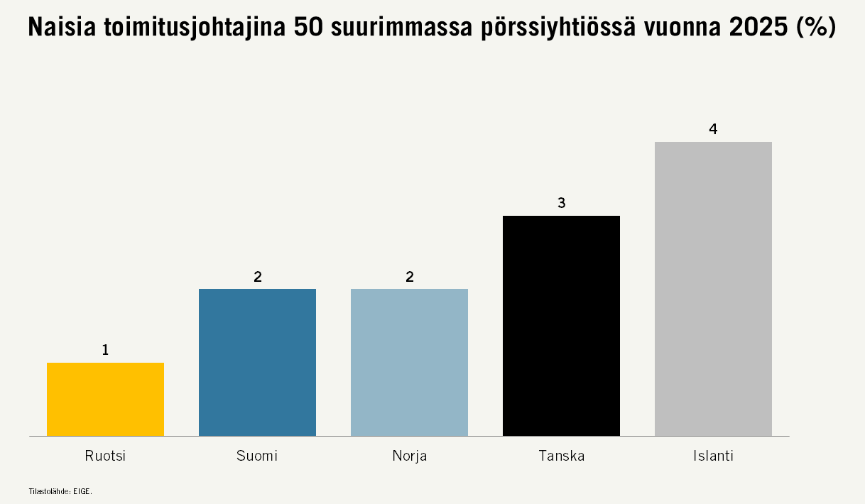 Myös muissa Pohjoismaissa suurimpien pörssiyhtiöiden toimitusjohtajanaisten lukumäärä on todella pieni verrattuna miehiin. Tämä kertoo, että ongelma ei ole kulttuurinen vaan rakenteellinen – myös tasa-arvostaan ylpeissä Pohjoismaissa.