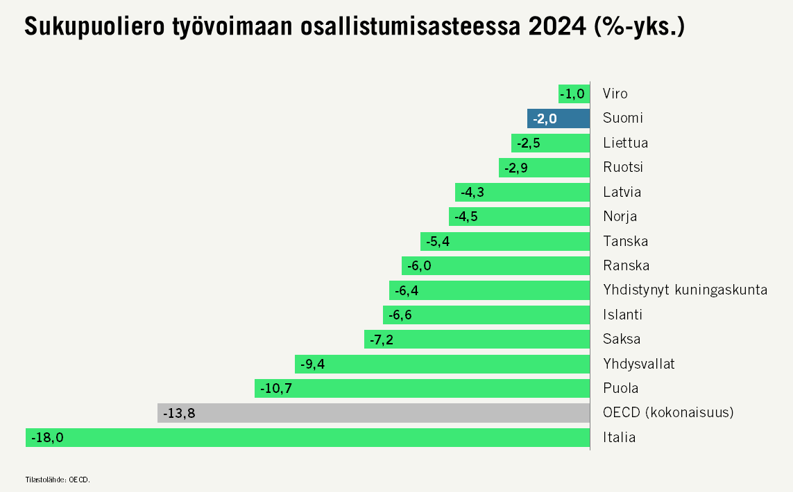 Suomessa sukupuolten välinen ero työvoimaan osallistumisessa on lähes kadonnut.