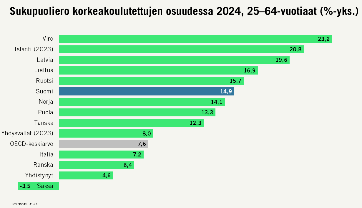 Korkeakoulutetuissa naiset ovat selvä enemmistö. Vuonna 2024 50,3 prosenttia 25-64 -vuotiaista naisista omasi korkeakoulututkinnon, mikä on huomattava etumatka miehiin (35,4 %) nähden. Vaikka naiset kouluttautuvat miehiä enemmän, he eivät etene samalla tahdilla yritysten ylimpään johtoon.