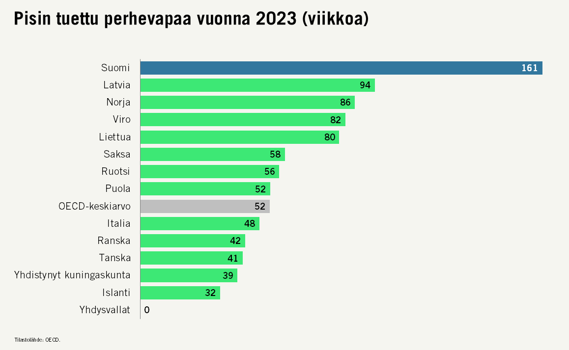 Suomen pitkät perhevapaat mahdollistava järjestelmä on kansainvälisesti poikkeuksellinen. Kun kotihoidontuki lasketaan mukaan, äiti saattaa olla poissa työstä vuosia.