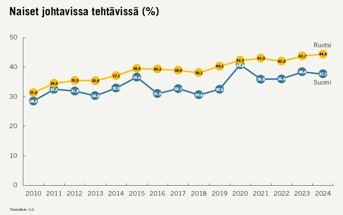 Tällä mittarilla mitattuna Suomi jää selvästi jälkeen Ruotsista, joka pysyy edelleen Pohjoismaiden kärkimaana. Siellä naisten osuus johtotehtävissä on jo yli 44 prosenttia.