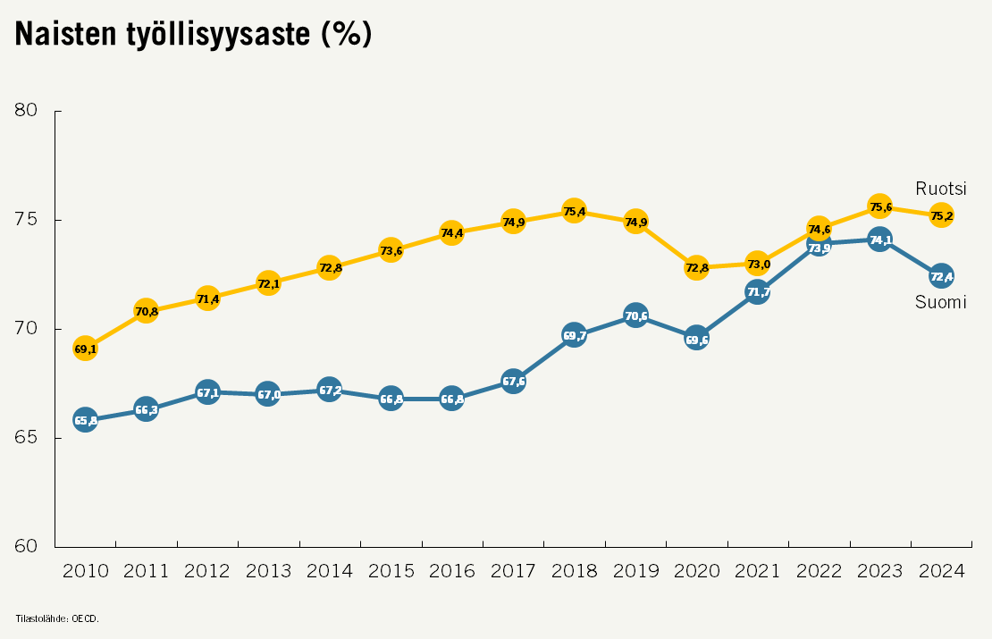 Suomi jää Ruotsin tasosta lähes seitsemän prosenttiyksikköä. Ero näyttää kovin pysyvältä muutoin hyvin samankaltaisten yhteiskuntien välillä.