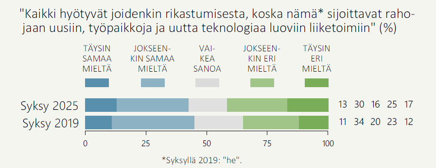 Suomalaisista 43 prosenttia ajattelee, että kaikki hyötyvät joidenkin rikastumisesta, koska nämä sijoittavat rahojaan uusiin, työpaikkoja ja uutta teknologiaa luoviin liiketoimiin (Kuvio 1). Eri mieltä rikastumisen yhteiskunnallisista hyödyistä on suunnilleen samansuuruinen joukko (42 %).