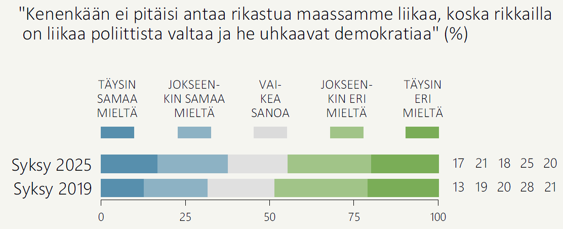 Vajaat neljä kymmenestä (38 %) katsoo, että kenenkään ei pitäisi antaa rikastua maassamme liikaa, koska rikkailla on liikaa poliittista valtaa ja he uhkaavat demokratiaa. Kuitenkin hieman suurempi osuus (45 %) ei pidä rikkaiden poliittista valtaa Suomessa uhkana demokratialle (Kuvio 2).