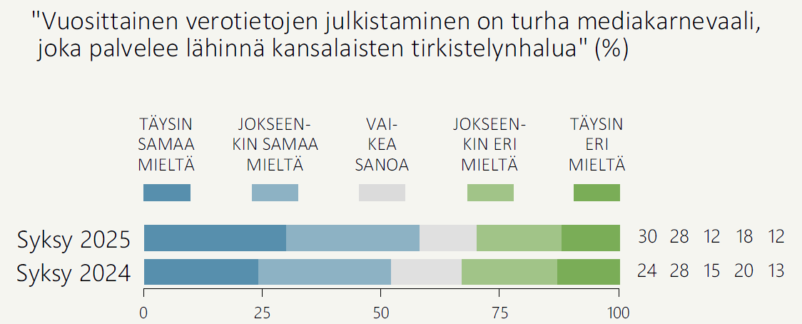 Huolimatta enemmistön periaatteellisesta valmiudesta verotietojensa julkisuuteen, suomalaiset suhtautuvat kriittisesti näiden tietojen reposteluun mediassa. Enemmistö suomalaisista (58 %) katsoo, että vuosittainen verotietojen julkistaminen on turha mediakarnevaali, joka palvelee lähinnä kansalaisten tirkistelynhalua (Kuvio 4). Eri mieltä verotietojen julkistamisen turhuudesta on 30 prosenttia.