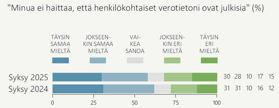 Suomalaisten enemmistöä (58 %) ei haittaa se, että henkilökohtaiset verotiedot ovat julkisia. Kolmannesta (32 %) omien verotietojen julkisuus kuitenkin haittaa (Kuvio 3).